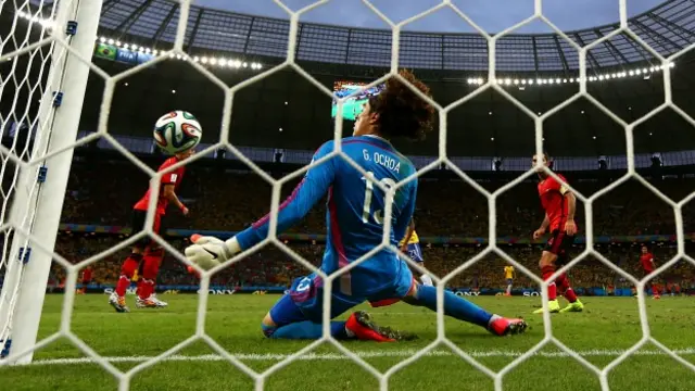 El balón se dirige como un bólido al palo derecho. Luiz Felipe Scolari alcanza a levantarse y empieza a celebrar cuando Guillermo Ochoa, sin quitar la mirada del esférico, se estira y lo desvía con la mano derecha.