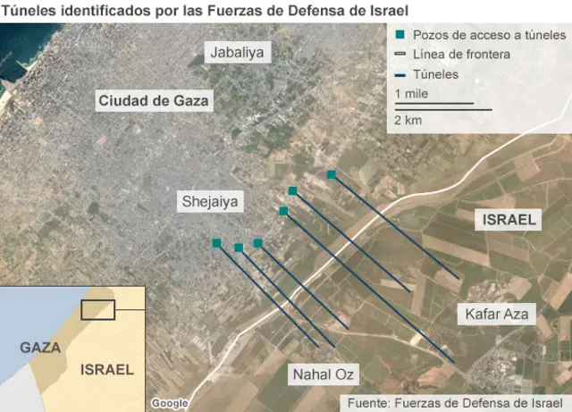 Las Fuerzas de Defensa Israelíes aseguran que han identificado más de 30 túneles, y el primer ministro Benjamín Netanyahu dijo que la ofensiva no se detendría hasta que hayan sido destruidos.