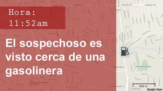 La central de policía transmite la información de que alguien que coincide con la descripción del sospechoso camina hacia una gasolinera.
