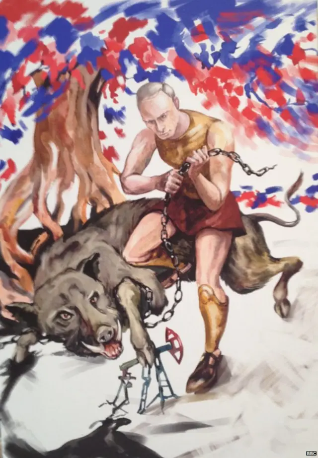 El objetivo: obras que muestran a Putin en el rol de Hércules llevando a cabo esas 12 extraordinarias hazañas.