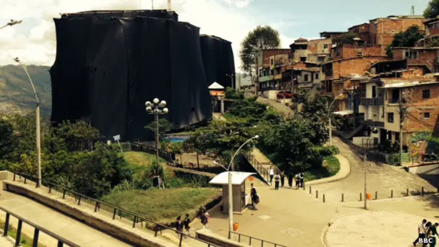 Los dos lugares no podrían ser más distantes, física y simbólicamente: uno es un barrio exclusivo y de casas caras en esta ciudad colombiana, mientras que la biblioteca se levanta en medio de Santo Domingo Savio, una zona pobre incrustada en los cerros que rodean el centro urbano.