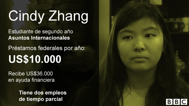 Cindy Zhang está estudiando asuntos internacionales y trabaja dos empleos a tiempo parcial para sobrevivir. Sus padres ayudan un poco, pero tiene préstamos de US$10.000 por año.