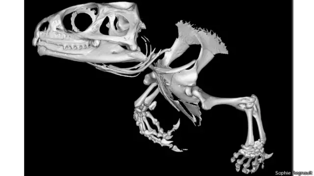 La imagen, creada por Sophie Regnault, del Colegio Real de Veterinaria de Londres, es una microtomografía computada del cerebro y las patas delanteras de un espécimen.