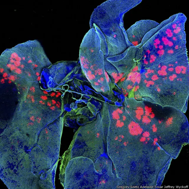 Lo que vemos en azul y verde son los pulmones de un ratón. Lo rosa son minipartículas.