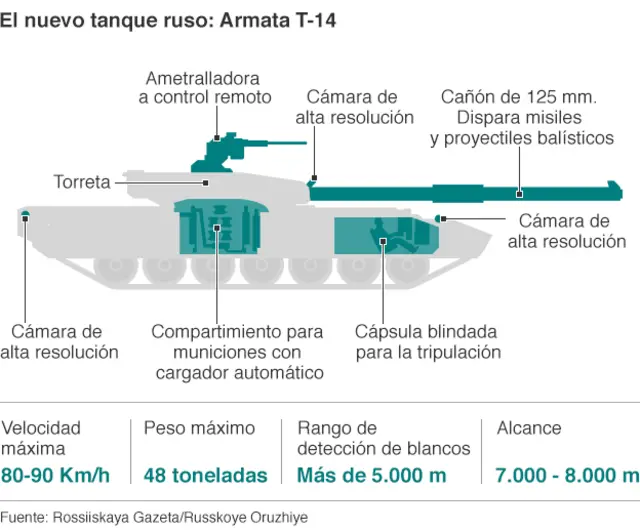 El Armata T-14 tiene una torreta manejada a control remoto con un cañón de 125 mm que puede tanto disparar proyectiles balísticos como misiles guiados.