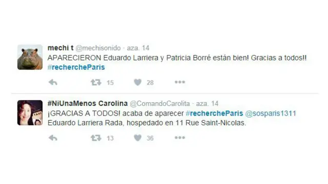 "¡Atención! Si alguien tiene noticias de Lola, de 17 años, en #Bataclan esta noche, contacten con nosotros", dice uno.