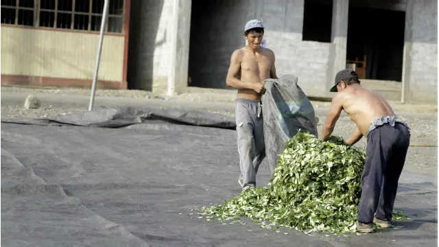 Pie de foto, Las hojas de coca se ponen a secar al sol.