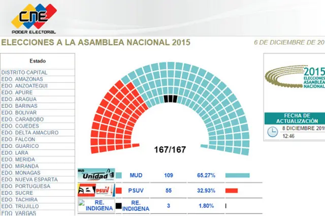Según la información publicada por el CNE en su página de internet, la opositora Mesa de Unidad Democrática obtuvo 109 curules en el voto lista y nominal, a los que hay que sumar tres diputaciones por las circunscripciones indígenas.