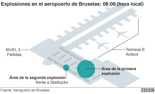 Las dos explosiones del aeropuerto se cree que tuvieron lugar en los extremos opuestos del área de facturación, una cerca del mostrador de la compañía American Airlines y otra junto a la cafetería Starbucks.