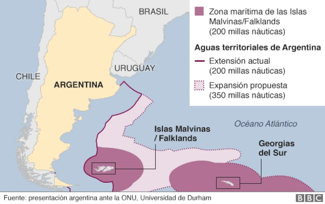 La nueva extensión abarcaría a las islas Malvinas/Falklands, un territorio no autónomo administrado por Reino Unido y cuya soberanía es reclamada por Argentina.