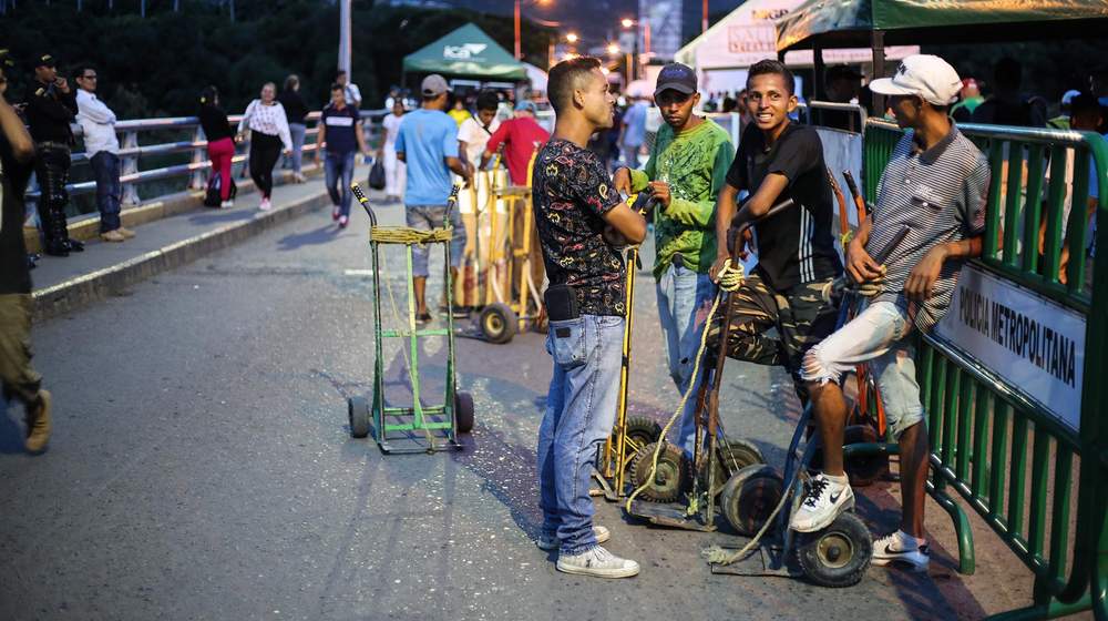 Johny, Ángel y Yember están dando vueltas por la mitad del puente, esperando que los venezolanos vengan. Vestidos con camisetas, jeans rotos y zapatillas, cada uno tiene un carrito de equipaje en la mano con una cuerda enrollada alrededor de las manijas. Están listos para atar las pesadas bolsas de los venezolanos que llegan y ayudarlos a cargarlas hasta la parada deautobús más cercana. Pero el trabajo como "maletero" es muy lento.