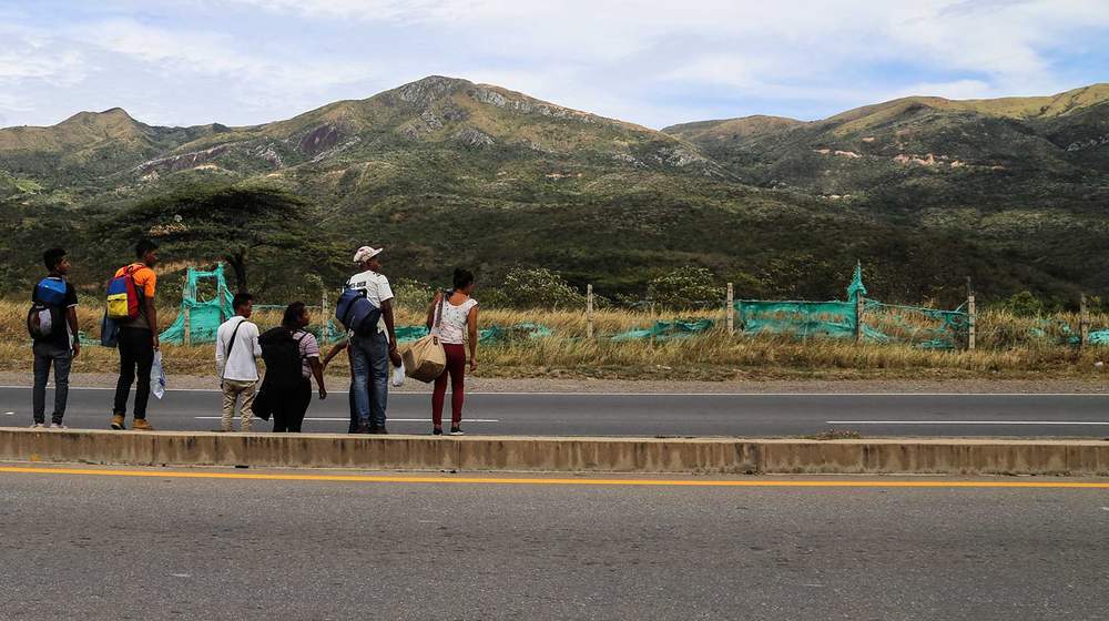 En la Ruta Nacional 55, una carretera principal que sale al sur de Cúcuta, siete venezolanos caminan a lo largo del camino, con la esperanza de conseguir un aventón. Llevan sus pertenencias colgadas a la espalda o en pequeñas mochilas. Una pareja tiene bolsas de agua.