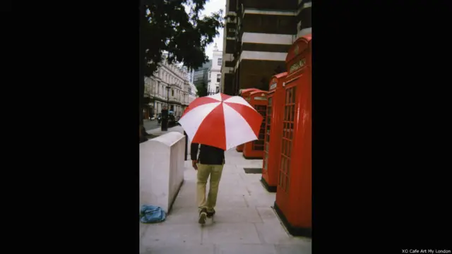 Un paraguas rojo y blanco en un matrimonio perfecto con las típicas cabinas telefónicas de Londres, un grupo de patos al atardecer en Hyde Park, un secreto pasillo de bambú en la ciudad.