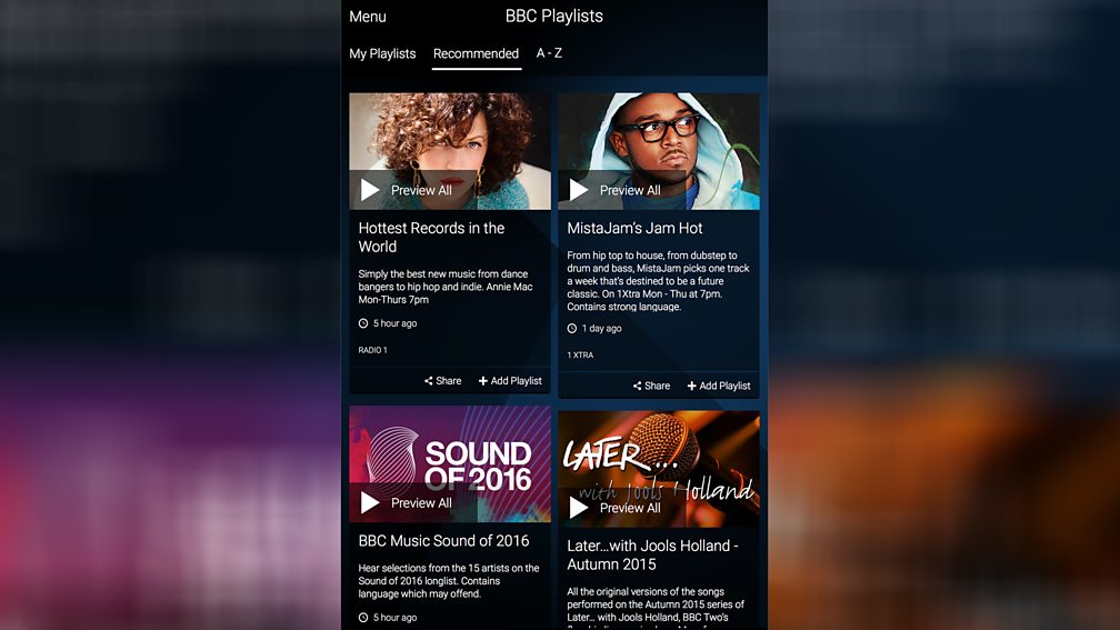So on top of enjoying the music you love the BBC Music app is also a gateway to unearthing fresh discoveries. Use the app to hear artists for the first time via specially selected playlists from your favourite shows, presenters and events. If you're always keeping an ear out for something new, the app will do the work to showcase exciting moments from artists you've yet to discover.