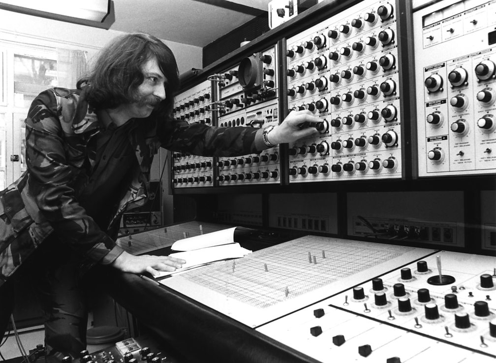 Workshop assistant Malcolm Clarke programming a large voltage controlled electronic music synthesiser called The Delaware.