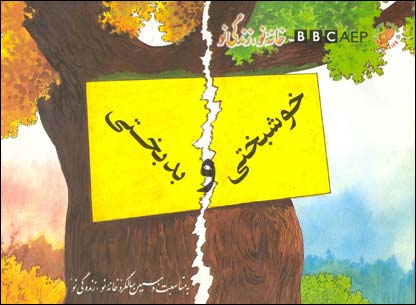 “ خوشبختى و بد بختى” از منابع هندى اداپت گرديده است. اين قصه تصويريست از يک گروه ( اجتماع) کوچک مردم به دو شکل متفاوت. در گروه اولى هر کس فقط به فکر خود است و به ديگران کمک نميکند. گروه دومى ميفهمد که يکجا زنده گى ميکنند و به کمک همديگر نياز دارند و بنا بر اين با همديگر کمک ميکنند. به اين ترتيب هر دو گروه به حيث الگوها در محل واحدى نشان داده شده ميشوند و به بيننده نشان داده ميشود که چقدر دلگير ميبود اگر اين جهان در دست مردمانى خود خواه، بى عاطفه و بى خير ميبود. مگر در مقابل اگر مردم در غم يکديگر شريک مى شوند ، با همديگر کمک ميکنند و خير شان به همديگر ميرسد چه زنده گى آرام ، بهشتى و سعادتمندى ميداشتند. گروه اولى از احوال همديگر بى خبر اند مگر گروه دومى بر اختلافات پيروز شده تحمل را به همديگر آموخته اندو دست به همديگر داده اند تا خوشبخت باشند. خواننده با خواندن قصه موقع خوبى به دست ميآورد تا هر دو گروه را باهم مقايسه کند و آيندۀ خود را درآن ببيند. کتاب طورى ساخته شده که در خواننده بحث هاى ديگر ى را که اهميت کليدى دارند برانگيخته ميتواند. با آنکه موضوع قصه کمى پيچيده و نظرى مينمايد اما طرح و شرح آن عملى ، ساده و براى فهميدن آسان است. کارکنان ادارۀ نشراتى افغان ( انا ) با اطمينان کامل گفته ميتواننند که خواننده گان ما از اين کتاب به حيث يک نمونه ( مودل ) کار خواهند گرفت و کوشش خواهند کرد که در بسيارى مثال هاى مشابه ديگر وموارد کار برد آنها فکر خواهند نمود.