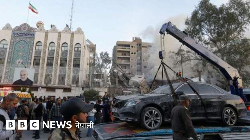 दमास्कसको मेज्जेह जिल्लास्थित इरानी वाणिज्य दूतावास भवन हमलापछि धुजाधुजा भएको अनलाइनमा राखिएका भिडिओहरूमा देखिन्छ।