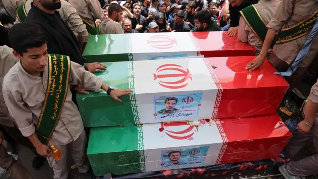 तेहरानको एन्घेलाब स्क्वायरनजिकै इरानी झण्डा ओढाइएका कमान्डरहरूको तस्बिरसहितका शव पेटिका मानिसहरूको भीडले घेरिएका थिए।