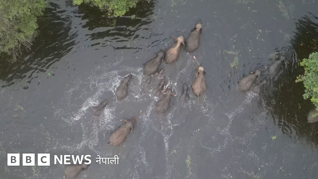 ड्रोनबाट खिचिएको यो भिडिओमा उत्तरी श्रीलङ्कामा एउटा जलाशय तर्न लागेका हात्तीहरूको बथान देखिन्छ।