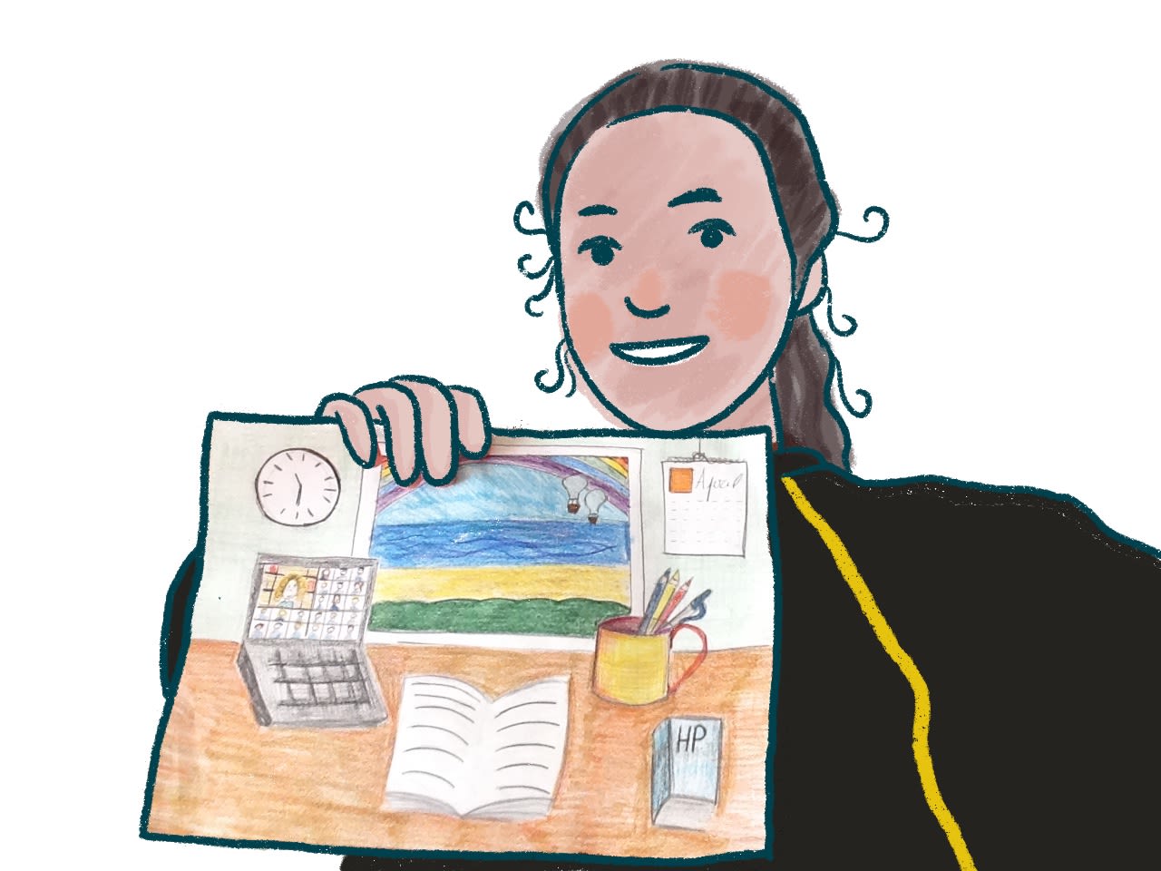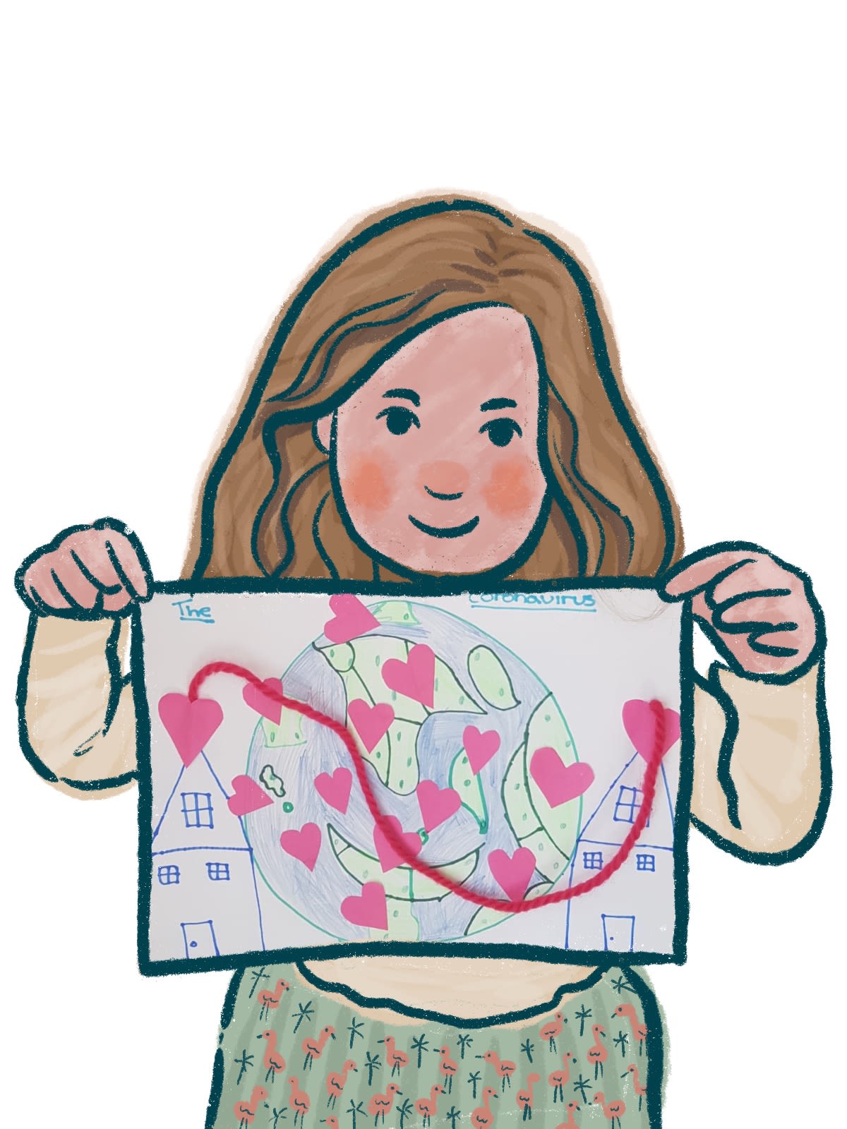 "पृथ्वीमा भएको हरिया बिन्दुले त्यो ठाउँ देखाउँछ जहाँ मलाई कोरोनाभाइरस छ जस्तो लाग्छ र त्यो संसारभरि छ। मुटुको चित्रले ती प्रत्येक देशमा माया पनि छ भन्ने देखाउँछ र समुद्रमा पनि माया छ किनभने पशुपक्षीमा पनि माया हुन्छ।"