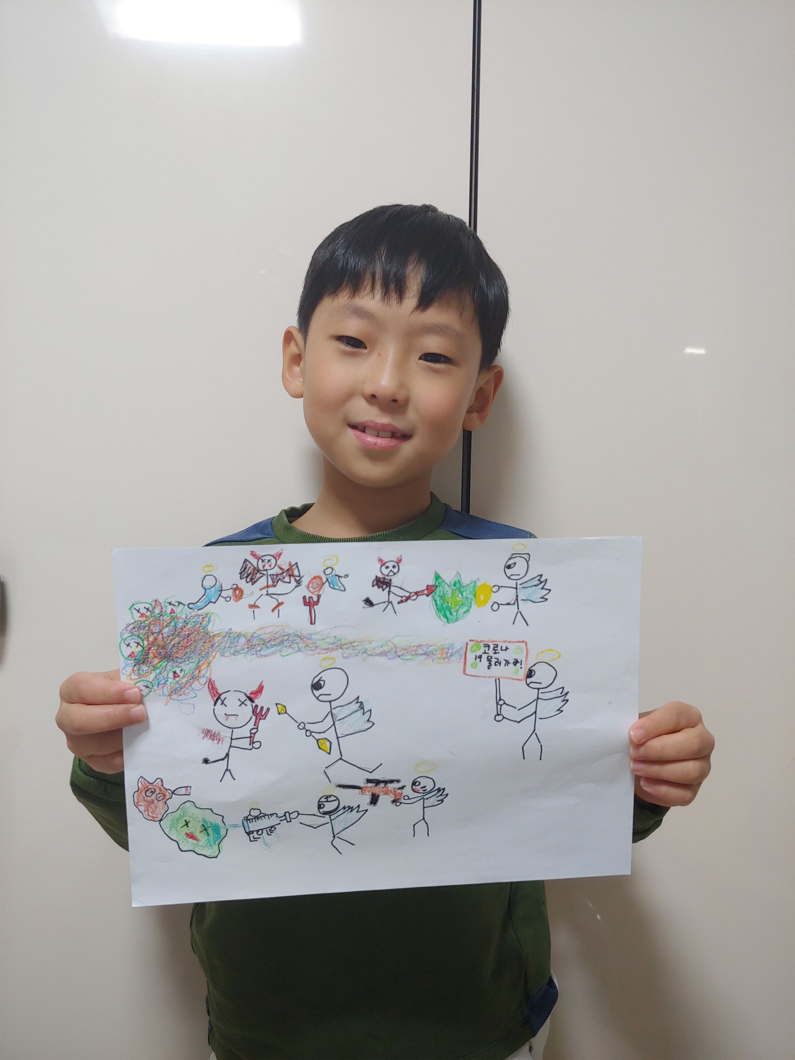 "मेरो चित्र कोरोनाभाइरसविरुद्धको युद्ध हो," ११ वर्षीय क्यून-ऊ भन्छन्।