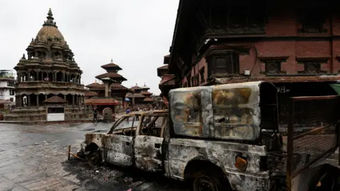 तस्बिरको क्याप्शन, पाटन दरबार क्षेत्रनजिकै प्रदर्शनकारीले जलाएको गाडीको भग्नावशेष