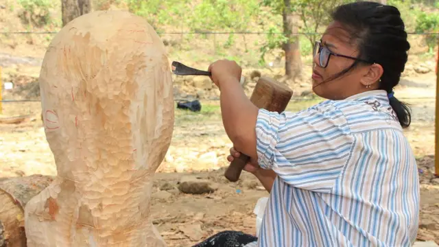 तीमध्ये मूर्तिकार अनमारी तामाङ एउटा काठको मुढोलाई आमाको मायाको प्रतीकात्मक विम्बमा ढाल्दै थिइन्।