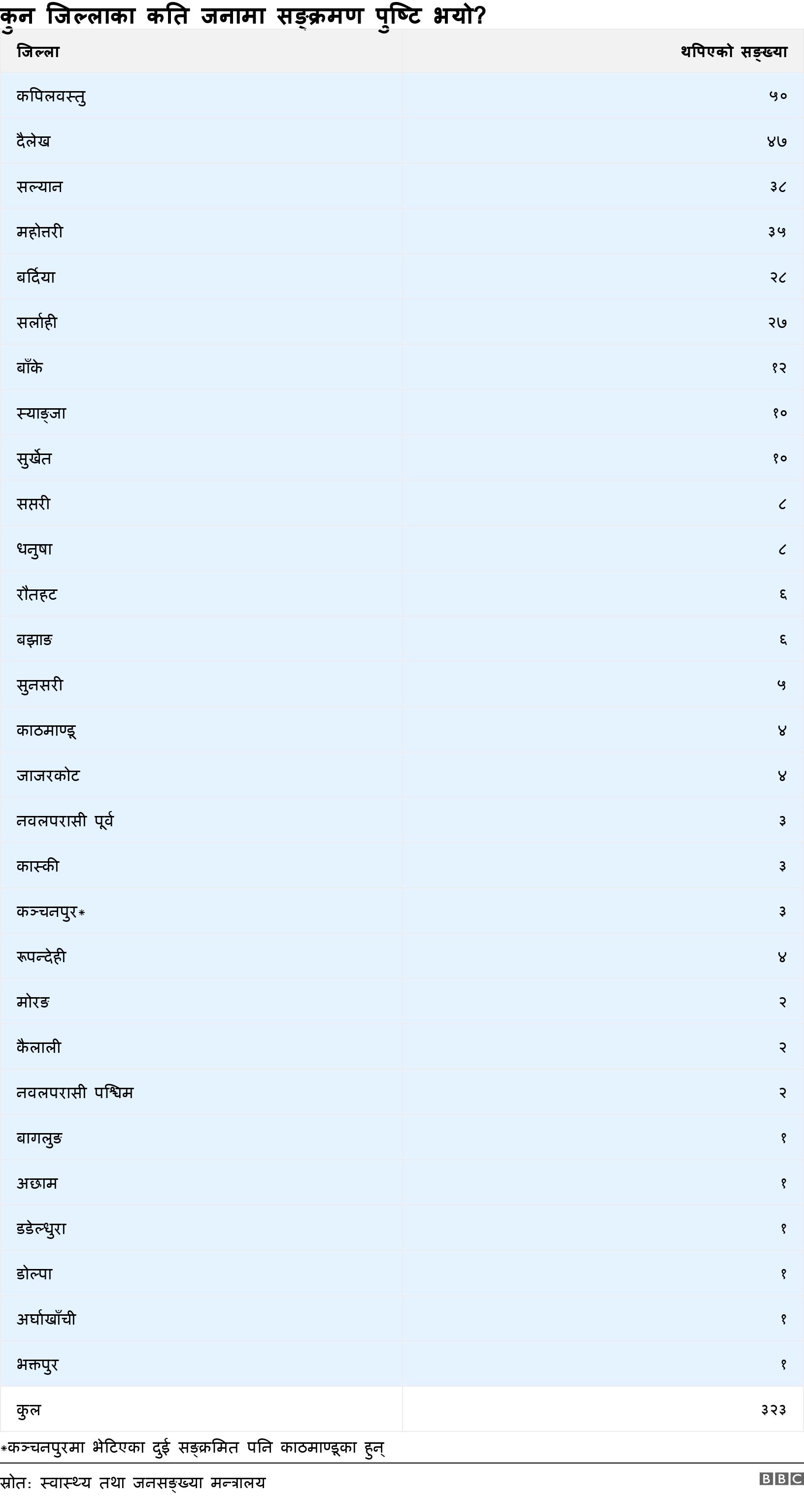 कपिलवस्तुका ५०, दैलेखका ४७, सल्यानका ३८, महोत्तरीका ३५ र सर्लाहीका २७ जनामा पनि कोभिड-१९ देखिएको छ।