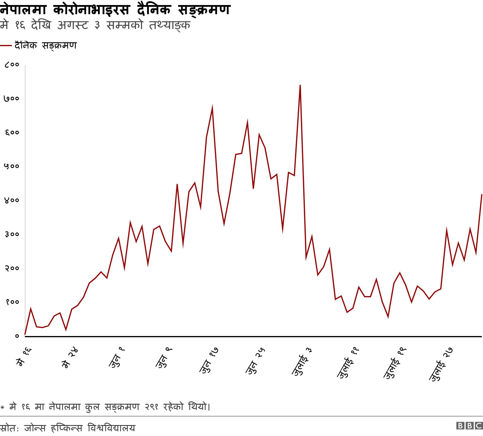 सोमवारको दैनिक सङ्क्रमण एक महिनाको अवधिमा सबैभन्दा ठूलो हो। यसअघि जुलाई २ मा सर्वाधिक ७४० जना सङ्क्रमित थपिएका थिए।