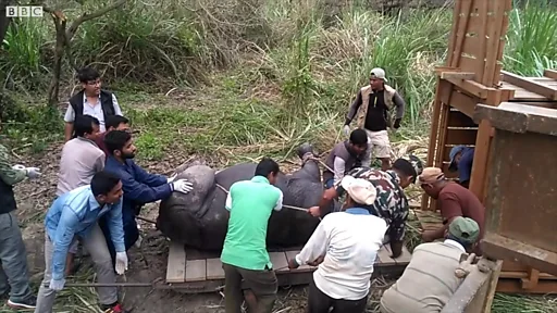 गैँडाको भीमकाय शरीरका कारण थोमस र उनको समूहलाई उक्त जीवको यौनाङ्गसम्म पहुँच दिन चिडियाखानाले क्रेनले गैँडा उठाउनु पर्यो।