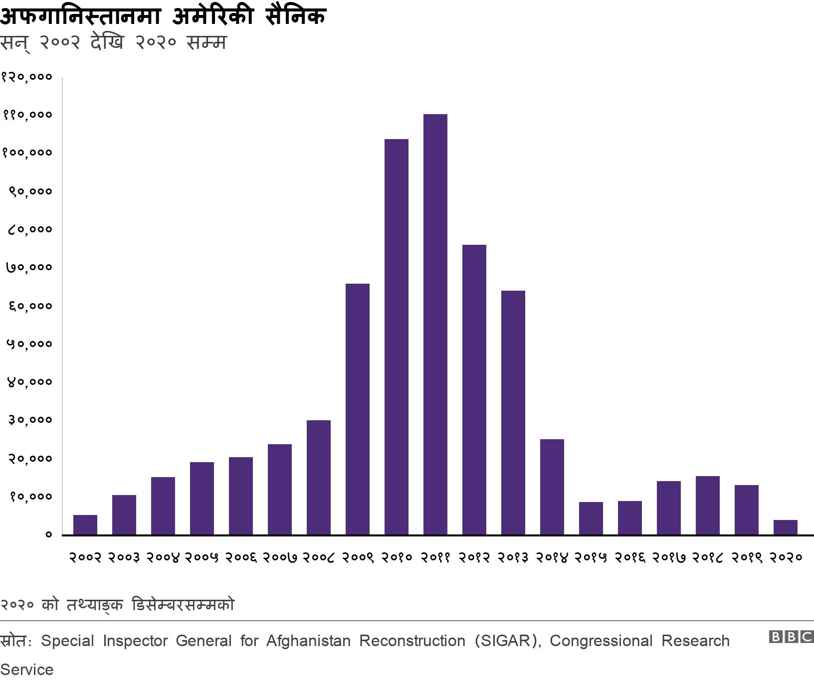 तालिबान विद्रोहविरुद्धको लडाइँ र पुनर्निर्माणमा वाशिङ्टनले अर्बौँ डलर खर्च गरिरहँदा सन् २०११ मा त्यहाँ परिचालित अमेरिकी सैनिकको सङ्ख्या अहिलेसम्मकै सर्वाधिक एक लाख १० हजार पुगेको थियो।