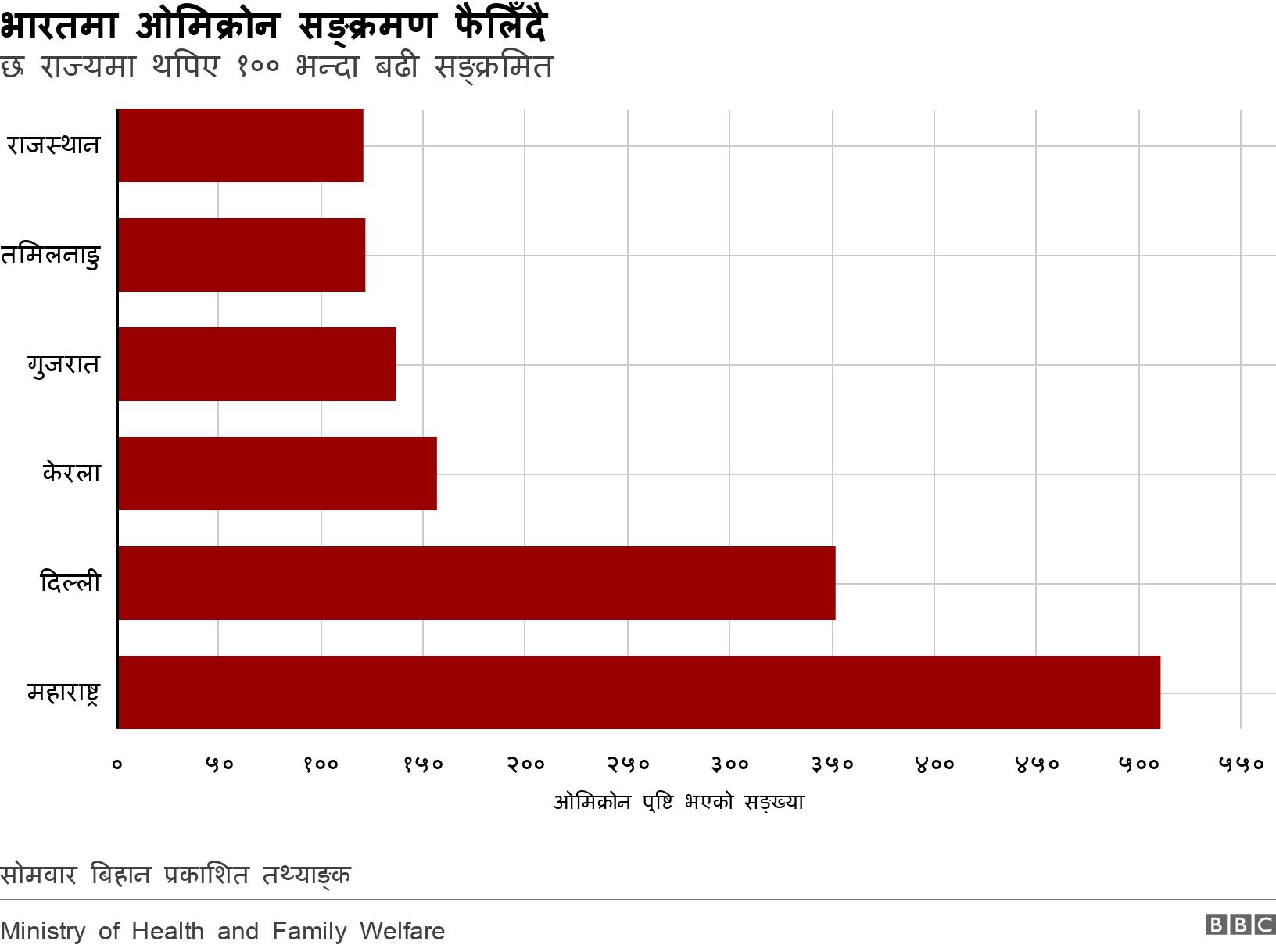 भारतमा ओमिक्रोन भेरिअन्टको कुल सङ्क्रमण १,७०० पुगेको छ। तीमध्ये सबैभन्दा बढी महाराष्ट्रमा ५१० जनामा ओमिक्रोन सरेको पुष्टि भएको छ।