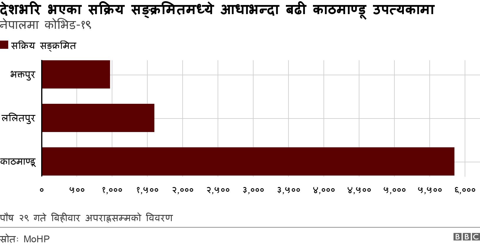 अहिले देशभरि सक्रिय सङ्क्रमितको सङ्ख्या १४,३४० छ। स्वास्थ्य तथा जनसङ्ख्या मन्त्रालयका अनुसार काठमाण्डू उपत्यकामा झन्डै ८,४०० सक्रिय सङ्क्रमित छन्।