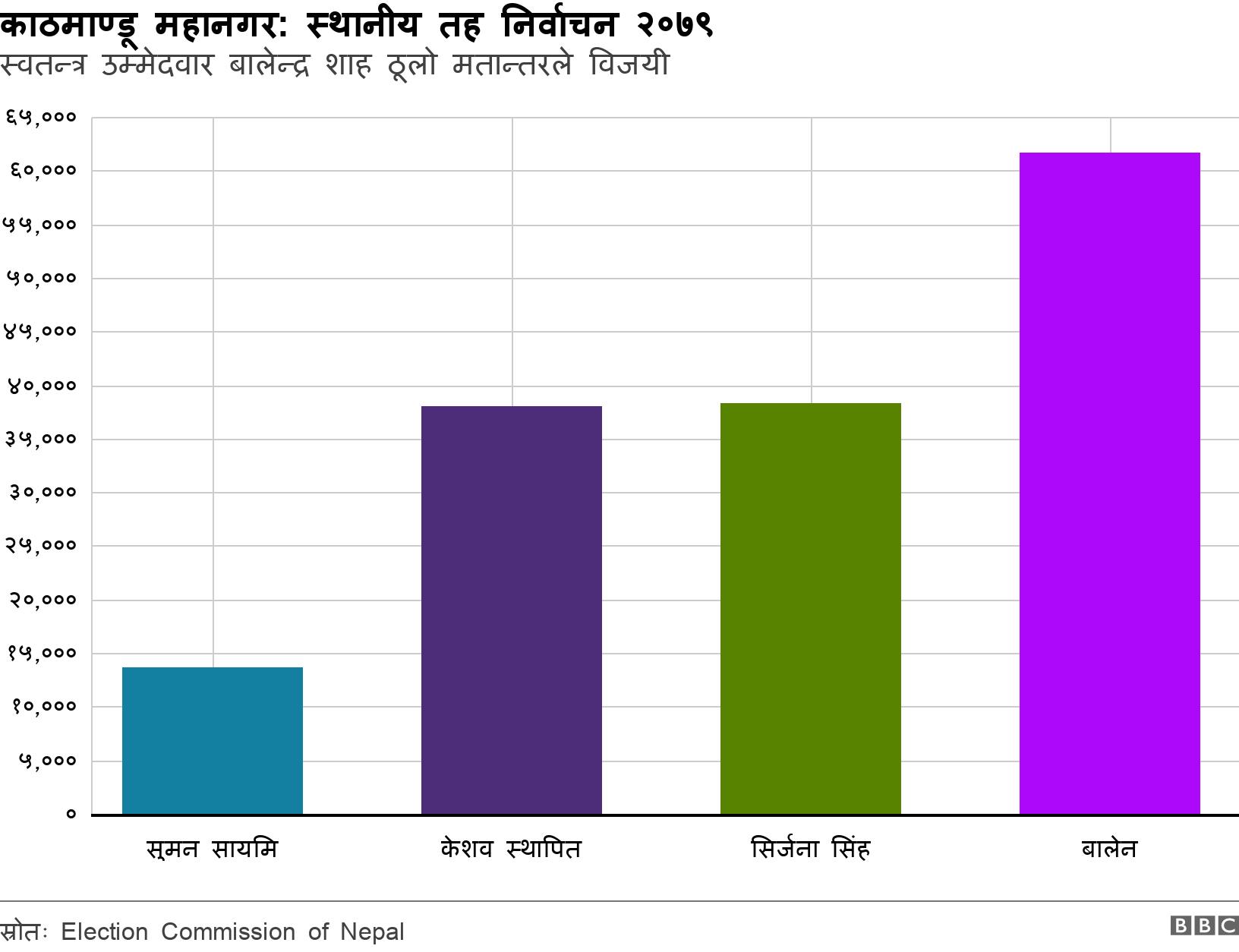 काठमाण्डू महानगरमा एक लाख ९१ हजार जनाले मतदान गरेका थिए।त्यसमध्ये बालेनले सबैभन्दा बढी ६१,७६७ मत पाएको निर्वाचन आयोगले जनाएको छ।