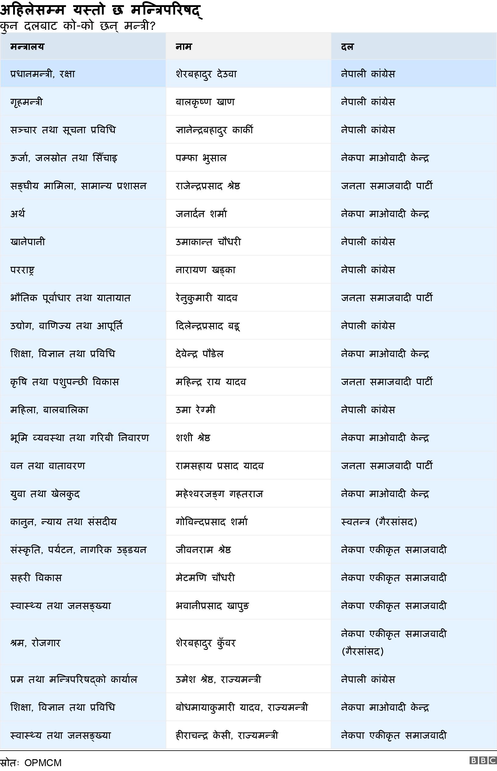 जनता समाजवादी पार्टीबाट सरकारमा राजेन्द्र श्रेष्ठ, रेनुकुमारी यादव, महिन्द्र राय यादव र रामसहाय प्रसाद यादव मन्त्री छन्।