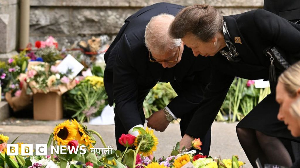तस्बिरको क्याप्शन, राजपरिवारका सदस्यहरू बाल्मोरलबाहिर शोक सन्देशहरू हेर्दै