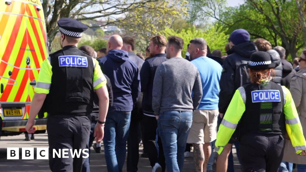 BBC Two Devon and Cornwall Police officers walking with a number of football supporters outside Home Park Stadium in Plymouth. They all have their backs to the camera. There is a police van parked in the distance along with a number of trees. BBC