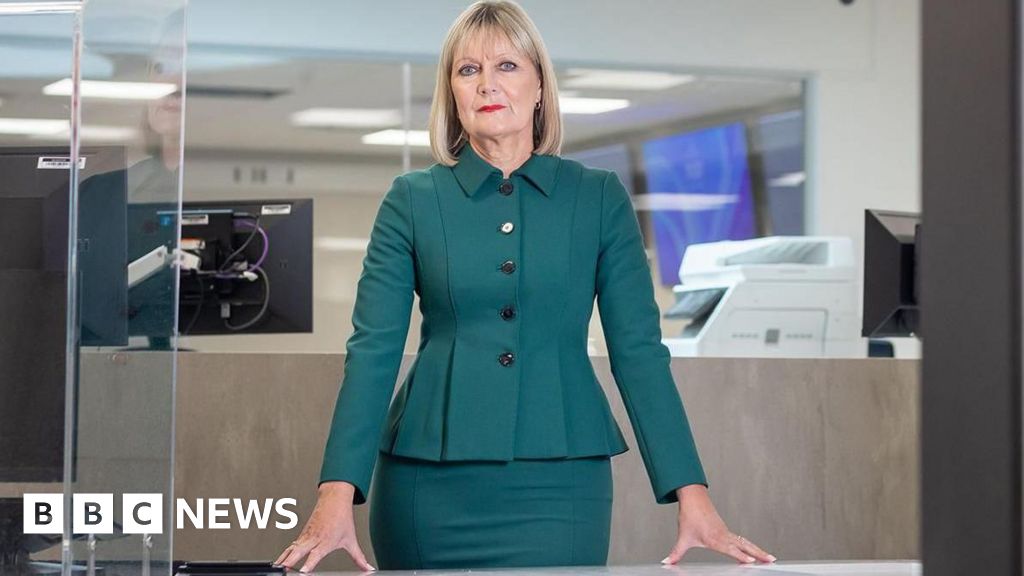 Durham Police and Crime Commissioner Joy Allen staring into the camera with her hands resting on a surface in front of her. She's got shoulder-length blonde hair and is wearing bright red lipstick. She's wearing a dark jacket that some people would say is blue and others green, with a matching skirt. She's standing in what looks like a police station. There are computers behind.