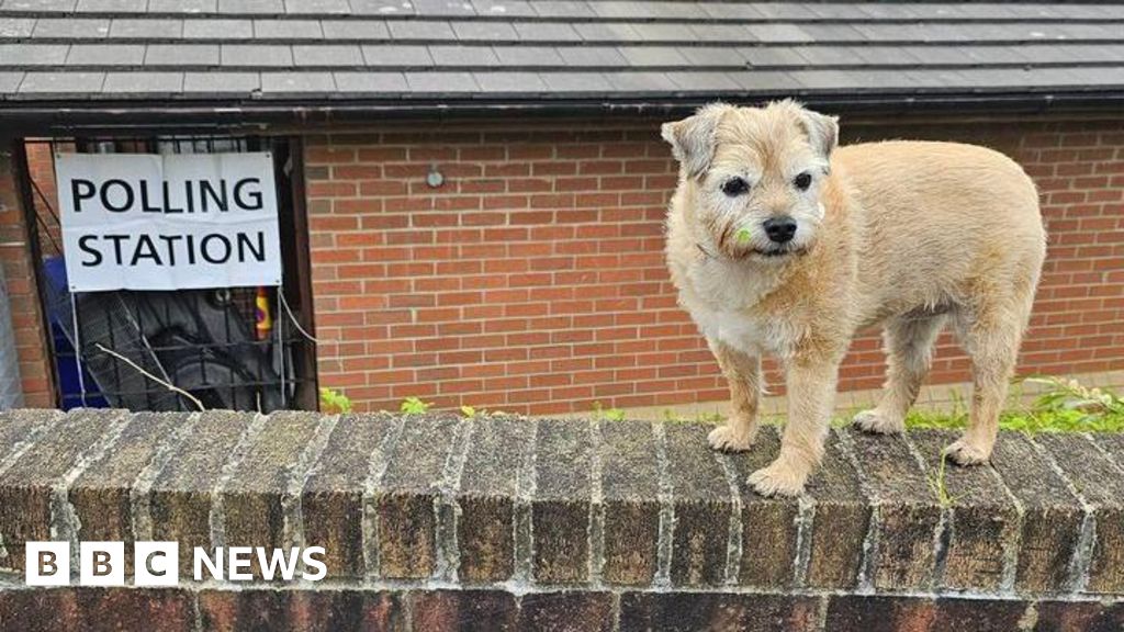BBC A small, short-haired, light brown coloured terrier dog is standing on a brick wall. In the background is a brick building with a black door and a sign saying "polling station"BBC