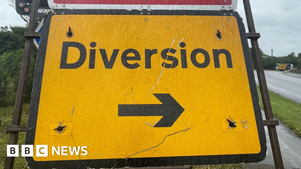 BBC A bright yellow road sign with a black arrow and diversion written on it. It is resting on a grass verge by the side of a road. BBC