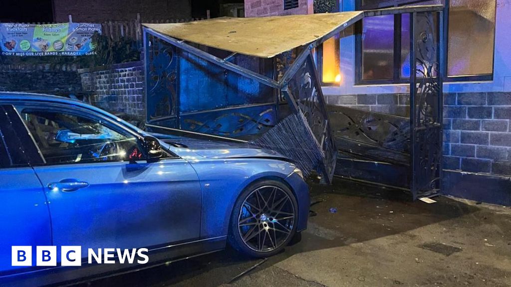 West Yorkshire Police said the blue BMW 335D struck the shelter at the Four Horseshoes in Milnsbridge, Huddersfield, just before 23:00 BST.