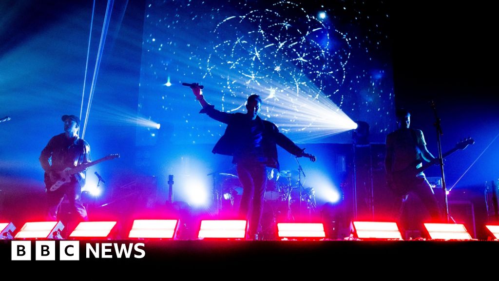 Getty Images The frontman of Coldplay, Chris Martin, stood on a stage singing into a microphone. He is wearing a blue t-shirt and black trousers. Crowds of people can be seen in front and behind him with their hands in the air. They all have blue light-up wrist bands on. Getty Images