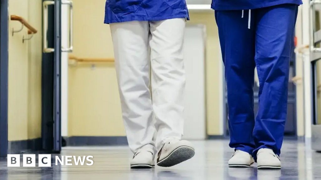 Getty Images Two unidentified members of staff are walking down a hospital corridor. Only their legs and feet can be seen. The staff member on the left is wearing white trousers and white shoes; the one on the right is wearing blue trousers and white shoes.Getty Images