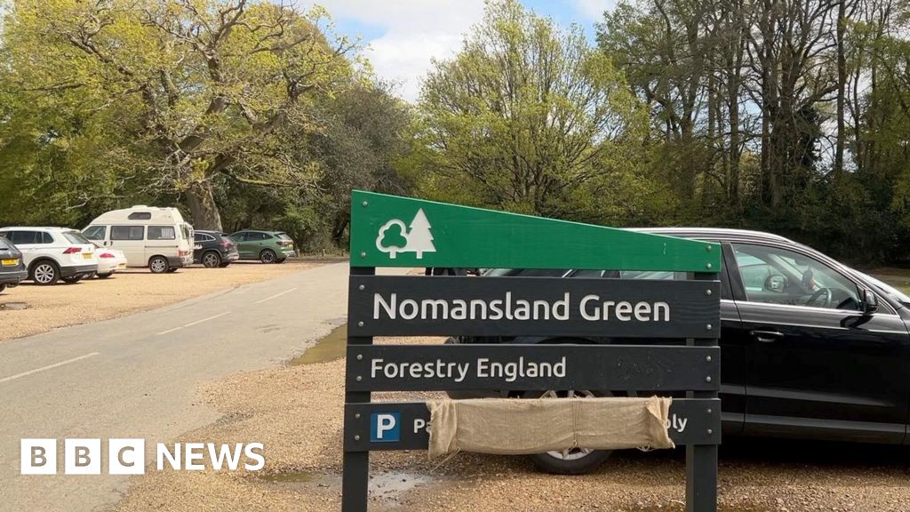 BBC A car park. A sign in the foreground reads "Nomansland Green, Forestry England." It is black and green with a cut-in symbol of a tree on the wood. In the background several cars are parked on gravel and a road between the two sides of the car park leads into a forested area. BBC