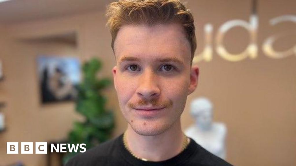 BBC Hair salon owner, Sam Cowan, is staring into the camera. He has short light brown hair and a moustache. He's wearing a black t-shirt with a gold necklace and he's standing in his hair salon. Behind him is the signage for his business, which is called Audacity, along with a large green plant and a white roman-style decorative bust.BBC