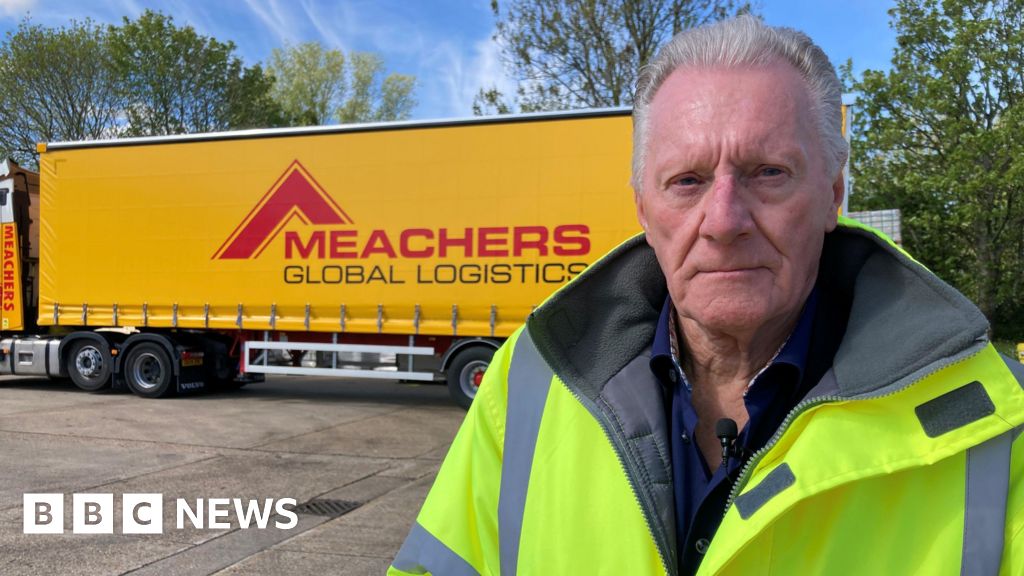 BBC Bob Terris is an older man with white hair and is wearing a yellow hi-vis jacket. Behind him is a yellow lorry with 'Meachers Global Logistics' printed on its side.BBC