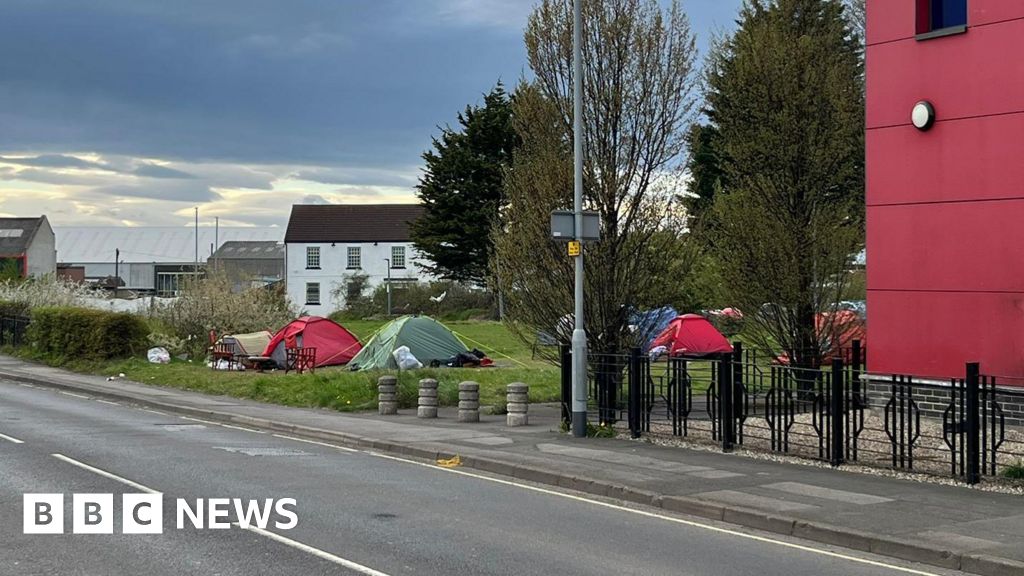 BBC A number of tents have been erected on a grassy area near a red building and a road. Chairs can be seen outside of the tents.BBC