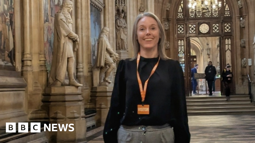 University of Wolverhampton A woman with fair hair, wearing an orange "visitor" lanyard over a black top, stands in an ornate hallway in Parliament with statues along the walls.University of Wolverhampton