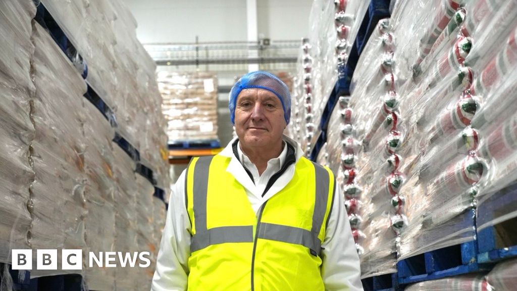 JOHN FAIRHALL/BBC A man in a yellow high viz, white overalls, white shirt and blue hairnet is looking straight at the camera in the centre of the picture. Behind him are pallets piled up high and covered in plastic.JOHN FAIRHALL/BBC