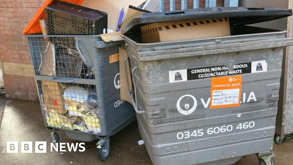 Alex Pope/BBC Two wheelie bins in the centre of Northampton, by a metal fence. A door is open to the right.Alex Pope/BBC